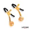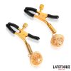 Siéntete sexy con estas pinzas para pezones en tonos dorados y negros. Cuenta con unos pequeños cascabeles adornados que le dan ese toque extra.